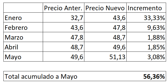 - e) PESOS CINCUENTA Y UNO CON CIENTO TREINTA Y DOS MILÉSIMAS ($ 51,132) por litro para las operaciones a llevarse a cabo en el mes de mayo de 2021.