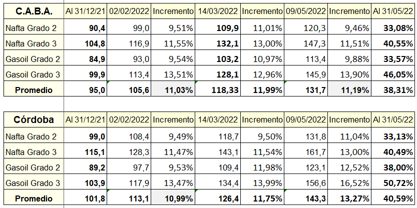 La evolución de los precios de los combustibles en los primeros cinco meses del año, fueron los siguientes (tomamos los valores de la Capital Federal que siguen siendo más bajo que los del resto del país, y los de la ciudad de Córdoba que están más cerca del promedio nacional).