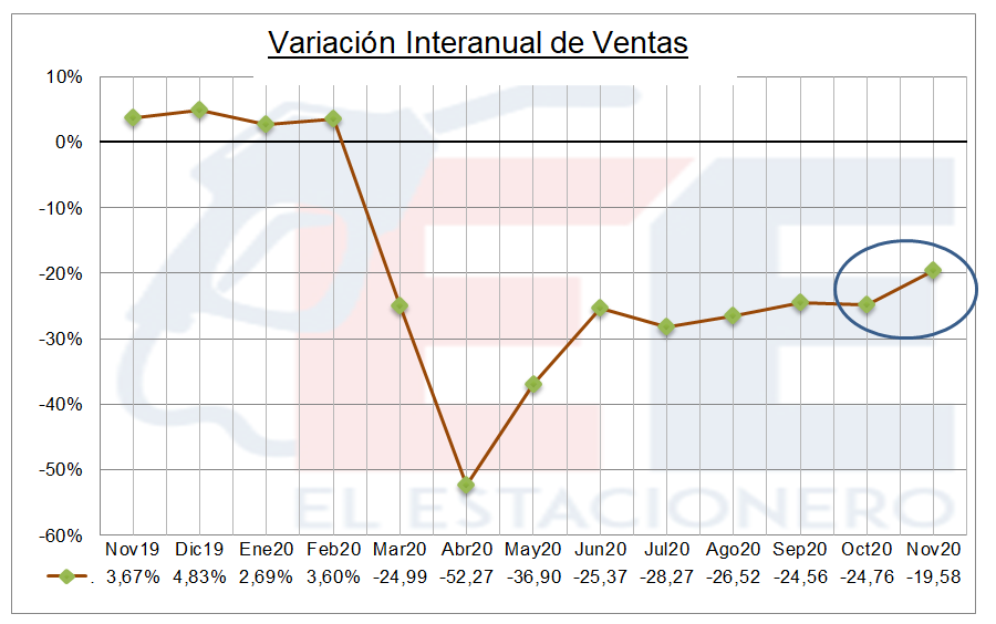 Luego de un amesetamiento en los niveles de ventas, en el mes bajo análisis hubo una recuperación en el comparativo interanual, ubicándose solo en un 19,58% por debajo de noviembre del 2019.