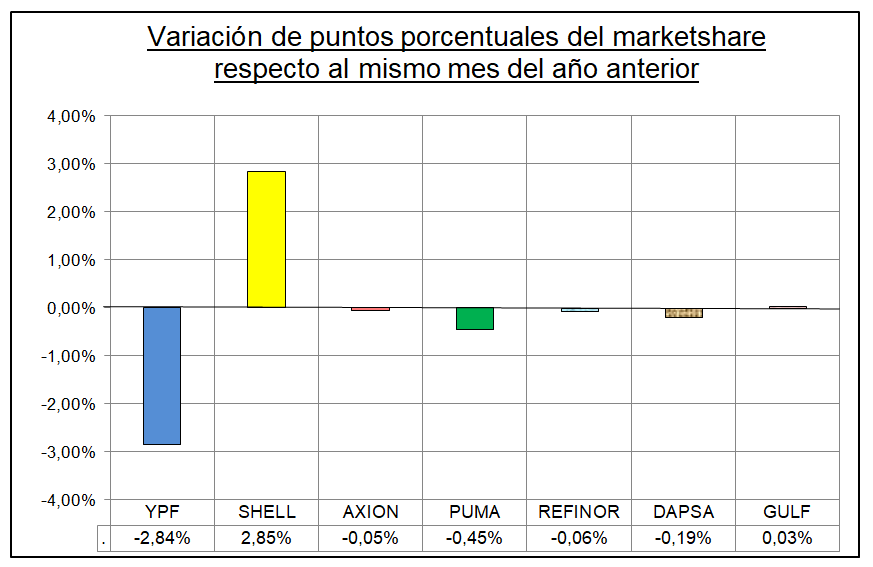 Observando la variación interanual en la participación en el mercado, puede apreciarse que hubo una clara ganancia de SHELL a expensas de YPF.