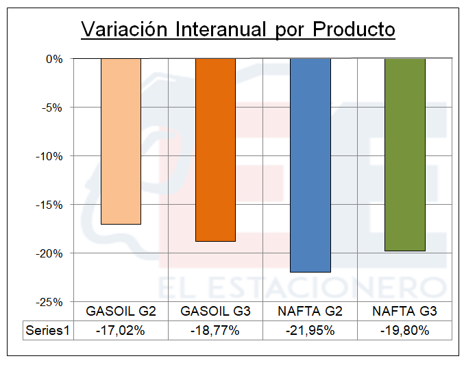 Si analizamos la variación de las ventas de cada producto en particular, se advierte que los porcentajes tienden a emparejarse, a diferencia de lo ocurrido en meses anteriores en que la caída de las naftas era mucho mayor que las de los gasóleos.