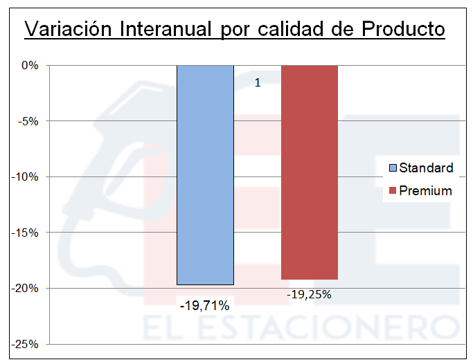 Otro tanto ocurre con la variación de las ventas discriminadas por su calidad, el a que los porcentajes son prácticamente idénticos, cuando en meses anteriores era mucho mayor la caída en los productos premium.