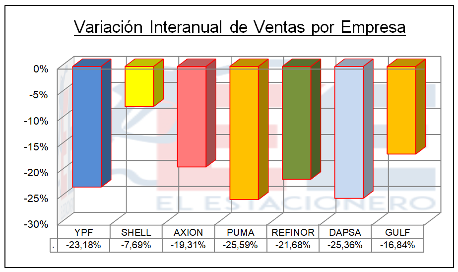 En la comparación interanual por empresa, todas tuvieron resultados negativos, si bien como se dijo, el total de ventas tuvo un diferencial menor al de los correspondientes a los anteriores meses de pandemia.