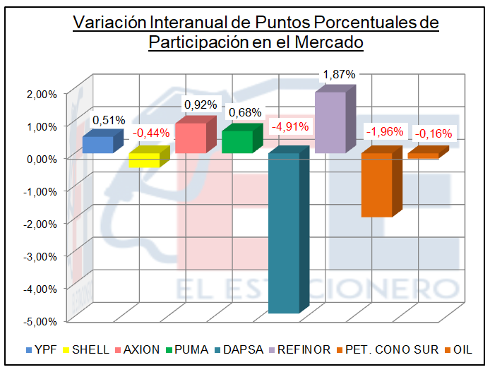 Con respecto a las variaciones en el Market share de cada compañía, no hubo grandes novedades en el mes de enero, ya que ninguna de las tres empresas de mayores ventas llegó a un punto de aumento o disminución en su participación en el mercado. El siguiente gráfico muestra el incremento o disminución de puntos porcentuales.