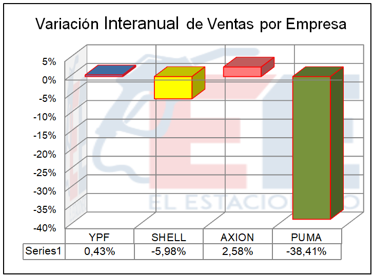 Las variaciones en las ventas discriminadas por empresa, nos muestran a YPF con un muy leve incremento del 0,43%, AXION con un crecimiento del 2,58%, SHELL con una caída del 5,98% y PUMA (en realidad TRAFIGURA vs esa misma empresa más PETROBRAS en el 2017), con una fuerte disminución del 38,41%.