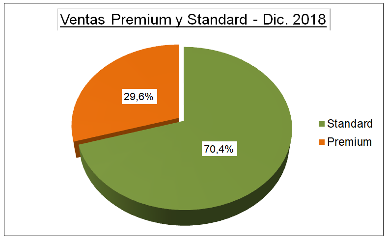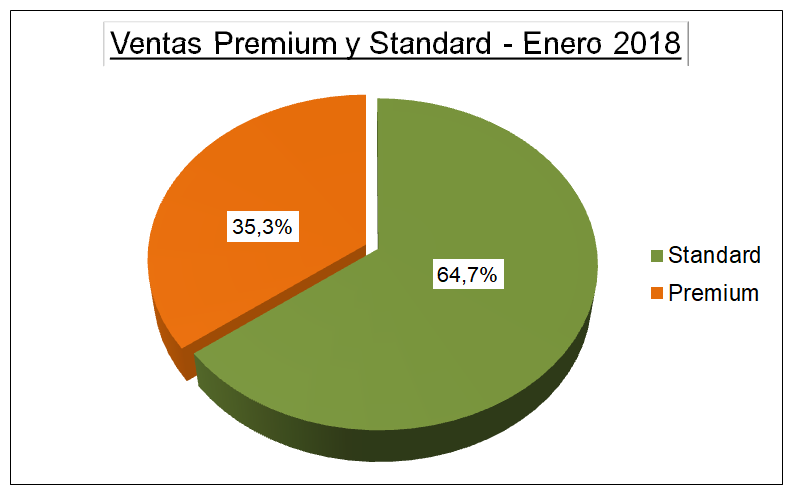 La comparación de la incidencia de los combustibles premium y standard en las ventas, nos muestra que los más caros vienen disminuyendo en su participación en el mercado. Esto puede verse claramente comparando la situación a comienzos del año 2018 y a finales del mismo.