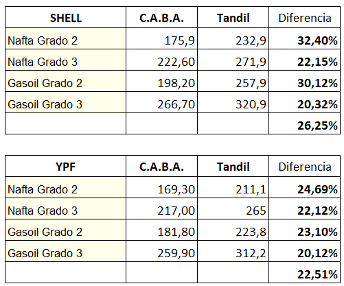 Con respecto a este último ítem, cabe mencionar, y agradecemos el dato al Ing. Alberto Fiandesio que nos lo hizo llegar, el caso de la localidad de Tandil, Provincia de Buenos Aires donde el precio de la nafta super de Shell está un 32,4% por arriba del vigente en las bocas de la misma sigla en la C.A.B.A., y el promedio de los cuatro combustibles se ubica un 26,25% más caros que en dicha capital. En el caso de YPF este precio plus de Tandil es de 24,69% en la nafta super y 22,51% en el promedio de todos los productos.