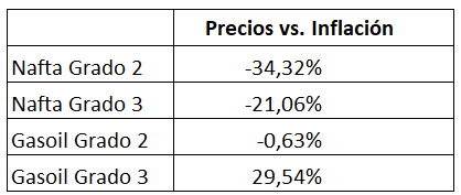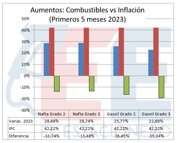 Tomamos el comparativo entre los incrementos de los precios de cada combustible y la Inflación entre el 1° de enero y el 31 de mayo del año en curso y vemos un notable atraso en los primeros, como se aprecia a continuación: