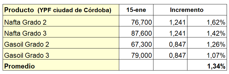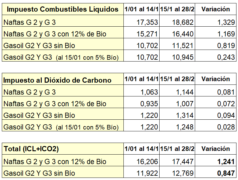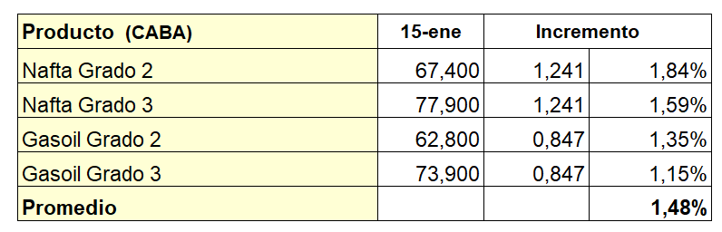 En el caso del gasoil, si bien es cierto que los impuestos se incrementan en el porcentaje mencionado, hay que tener en cuenta que el porcentaje de corte con biodiesel del 10% que establece la ley, no se estaba cumpliendo, por lo que considerando la recuperación gradual del porcentaje de mezcla establecida por la Secretaría de Energía (5% en enero, que pasará a un 6,7% en febrero, a un 8,4% marzo y volverá a un 10% en abril), la incidencia será menor.