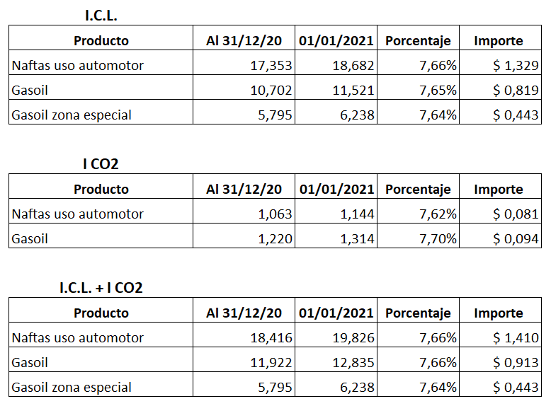 No obstante, las variaciones de precios mencionadas y las que en los próximos días puedan producirse, corresponden a los valores de los productos. El día 1° de enero próximo entrará en vigencia el nuevo cuadro del Impuesto a los Combustibles Líquidos y el Impuesto al Dióxido de Carbono, que regirá hasta el día 14 de dicho mes, según el siguiente detalle: