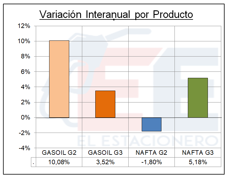 Las variaciones de los volúmenes discriminadas por tipo de combustibles, nos muestran un incremento en todos los productos, excepto en las Nafta Grado 2, que es precisamente el de mayor venta promedio en las estaciones de servicio