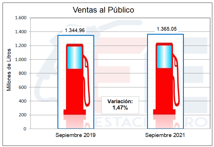 Por primera vez desde el comienzo de la pandemia (19 meses), se vendieron más litros de combustibles que en el mismo mes del año 2019, año no afectado por los efectos de la enfermedad, aunque no podría considerarse totalmente normal, ya que se registraban bajas ventas por otros motivos. El pequeño incremento se ubicó en el 1,47%. Como dijimos en presentaciones anteriores, es posible que las ventas de gasoil estén algo aumentadas por alguna desviación de este producto del canal estaciones de servicio al de agro o industria, que se observaban incrementos en los precios mayoristas, que se ubicaban claramente por encima de los pagados por las bocas de venta al público.