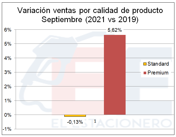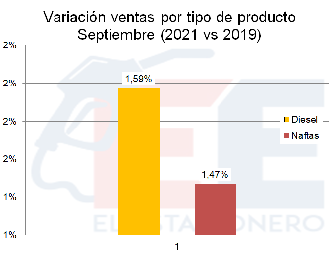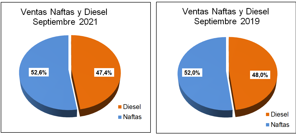 En la discriminación por producto, se advierte un aumento de cierta significación en los productos más caros: Nafta y Gasoil Grado 3 y se ubicó abajo de los valores de septiembre del 2019 la Nafta Grado 2 (el más vendido en las estaciones de servicio), aunque en unas décimas porcentuales