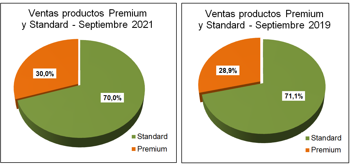 Comparativo de la participación en el total de las ventas de los productos premium y standard, Con respecto al año 2019