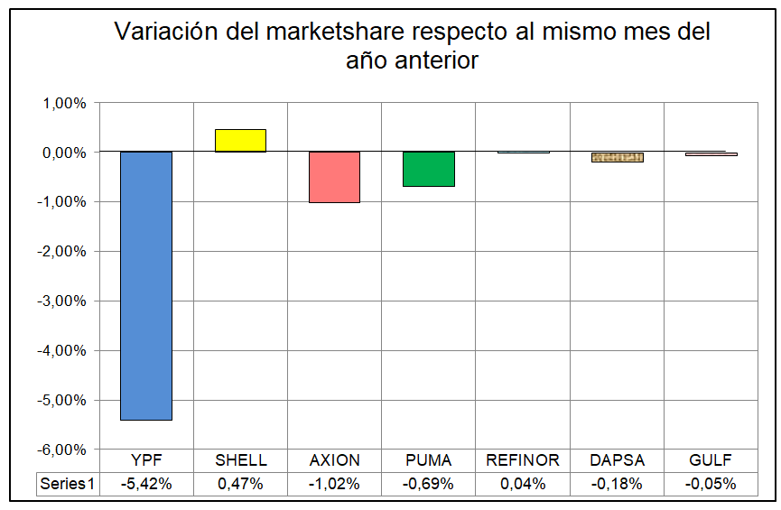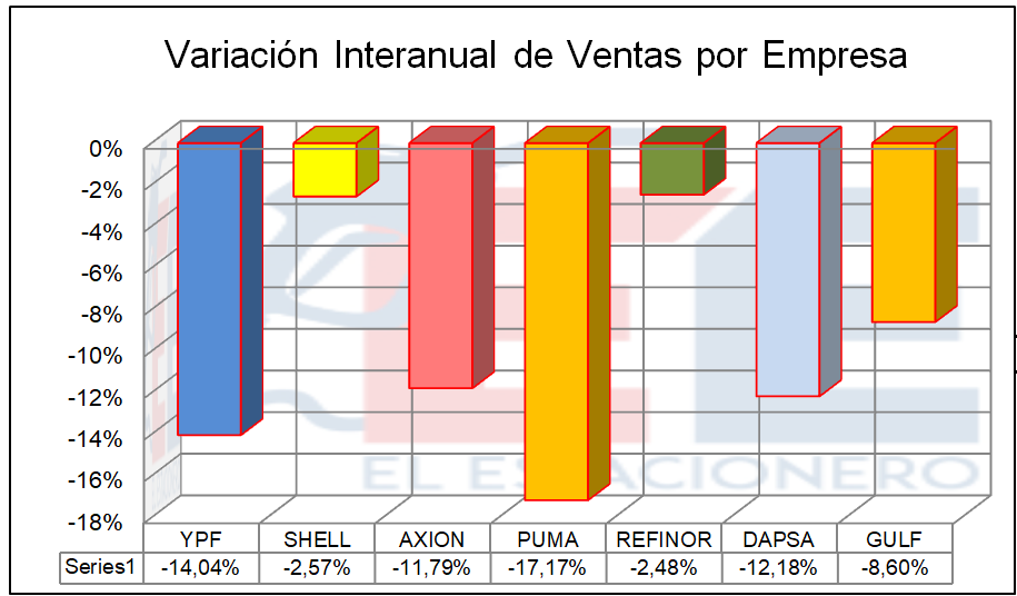 Las ventas en términos interanuales siguieron una tendencia similar a la de meses anteriores: YPF vio caer sus ventas en un 14,04%, mientras que Refinor lo hizo en un 2,48%