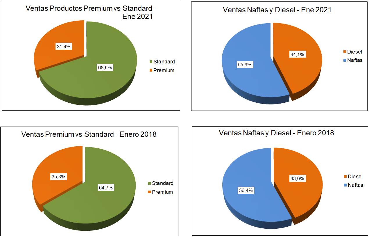Comparando con la situación de hace tres años, la participación de los productos premium es menor en la actualidad, mientras que la relación entre naftas y gasóleos es similar.