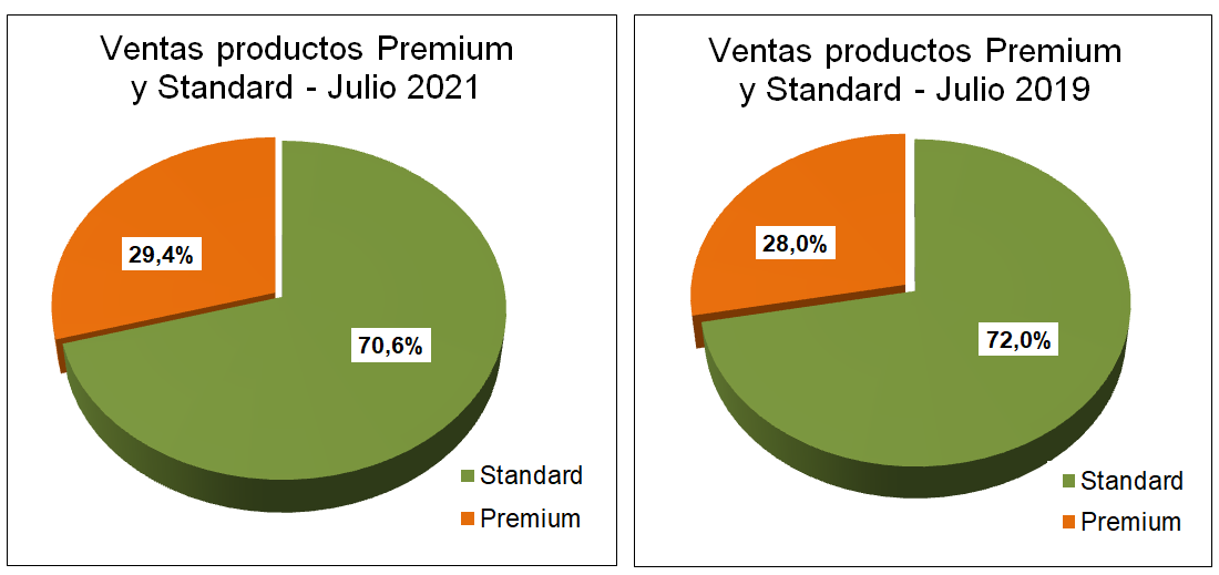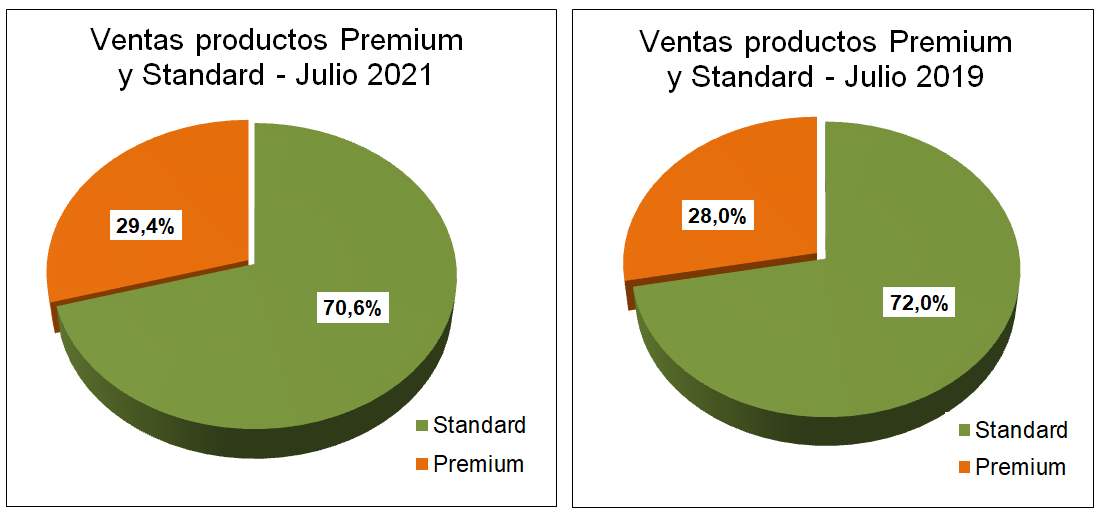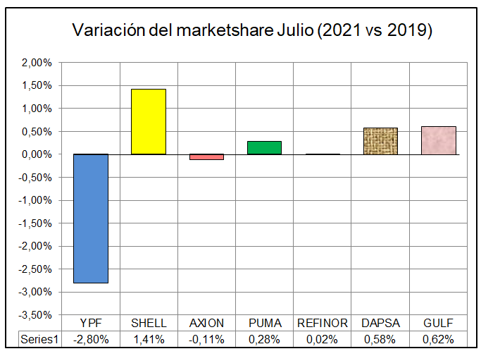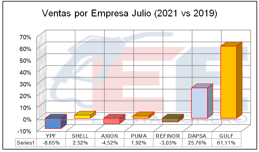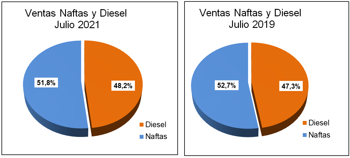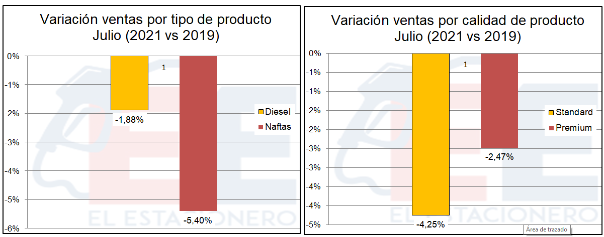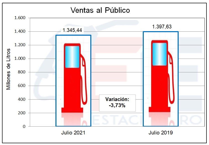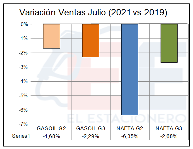 Las cifras son las correspondientes al mes de Julio ppdo. y los comparativos son con respecto a Julio del año 2019, último año «normal», entre comillas ya que pese a no haber sufrido todavía la influencia de la pandemia, fue un año malo en materia de ventas y rentabilidad para las estaciones de servicio.