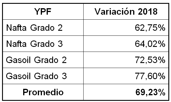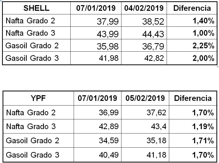 Entre ayer y hoy se dio el primer aumento de precio de los combustibles del año 2019. En esta ocasión dio el puntapié inicial la empresa SHELL, que ayer incrementó el precio de sus productos en un 2,09% promedio. Fue seguida en el día de la fecha por YPF, empresa líder del mercado, con un incremento algo menor: 1,65%.