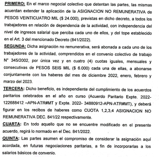 Así, la suma de $24.000 (pesos veinticuatro mil) dispuesta por el DNU citado, será abonada a cada uno de los trabajadores de la actividad –con independencia del nivel de ingresos salariales que perciba cada uno de ellos-, comprendidos en el CCT Nº 345/02, por única vez y en cuatro (4) cuotas iguales mensuales y consecutivas de $ 6.000 (pesos seis mil) cada una, conjuntamente con los haberes del mes de diciembre 2022, enero 2023, febrero 2023 y marzo 2023.