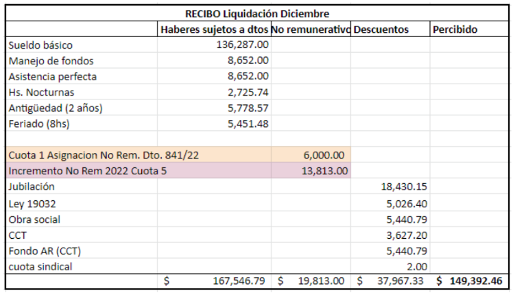 Para la confección del mismo se toman los datos del Anexo III del Acta suscripta el día 17 de noviembre de 2022 que tiene en cuenta las escalas salariales y los incrementos no remunerativos en su conjunto en los dos primeros acuerdos citados. A ello se le adicionan 4 cuotas iguales NO REMUNERATIVAS PARA TODO CONCEPTO a pagarse en diciembre, enero, febrero y marzo a todo el personal del convenio.