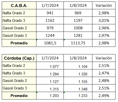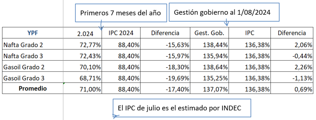 Hasta el día de hoy y en lo que va del año 2024, los valores de los combustibles han crecido un 71% promedio y la inflación fue del 88,40% (Aclaración: del IPC de julio no hay valores, por lo que el Indec hace un estimado); es decir que la nafta y el gasoil se incrementaron menos que el índice de precios al consumidor durante los primeros siete meses del año. Sin embargo esto no fue obstáculo para que las ventas cayeran fuertemente en los últimos meses.