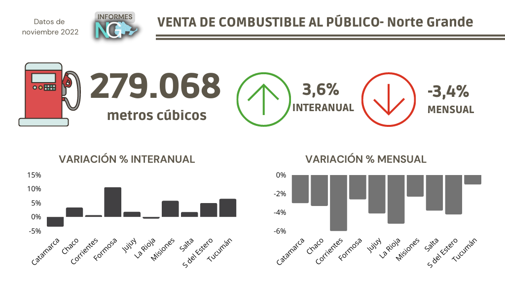 Las provincias del NEA y NOA registraron subas en la venta de combustible en la comparación interanual en Noviembre, pero tuvieron caídas respecto del mes anterior y hay una tendencia a la desaceleración en la tasa de crecimiento.
