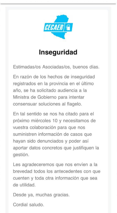 CECAER se dirigió a sus asociados por el problema de la inseguridad