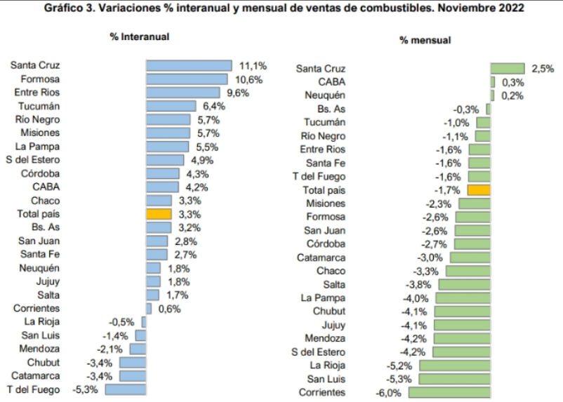 Un informe de la consultora Politikon analizó el comportamiento de las ventas de combustible en todo el país y concluyó que en noviembre 2022, la venta al público totalizó unos 1,52 millones de metros cúbicos (54% naftas y 46% gasoil), exhibiendo un incremento del 3,3% interanual pero un descenso del 1,7% en la comparación mensual.