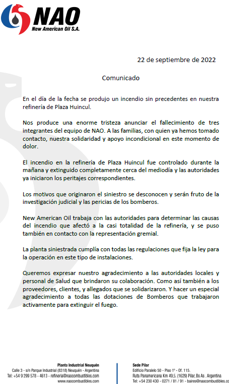 Con motivo del incendio de su refinería de Plaza Huincul, New American Oil S.A., emitió un comunicado.