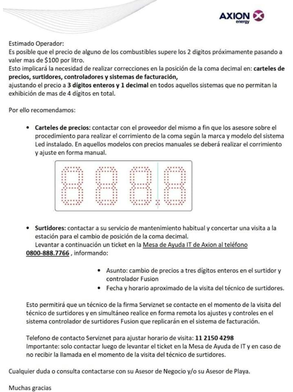 Hace pocos días desde este medio informamos sobre las recomendaciones de las compañías petroleras a los estacioneros para que tomen los recaudos para cuando llegue el día en que el precio de un producto supere los $99,99. En aquella ocasión se hacía referencia a los surtidores que deberán adaptarse a precios de tres dígitos y un decimal. Comentábamos en ese momento que solo faltaba un incremento del 9% en la nafta grado 3 para llegar a esa situación. Hoy el aumento necesario para esa instancia es en algunas provincias de solo el 5,8%; es decir, falta poco.