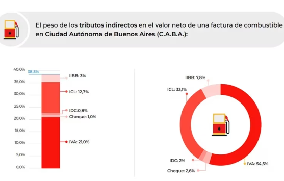 En CABA, los impuestos aplicados sobre los combustibles encarecen el valor en boca de expendio un 38,5 por ciento. Esto se debe al 21% de tasa del IVA, el 12,7% de Impuesto a los Combustibles Líquidos (ICL), un 3% en concepto de Ingresos Brutos, un 1% de Impuesto a los débitos y créditos bancarios (cheque) y un 0,7% de Impuesto al Dióxido de Carbono (IDC), que sumados explican 28% del precio final y que, al sumarse a los costos antes de impuestos engordan en más de 38% el precio a pagar por los consumidores.