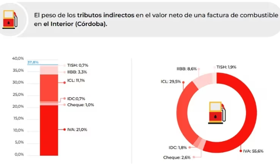 De acuerdo al informe del Iaraf, en Córdoba los impuestos encarecen un 37,8% el precio final de los combustibles en boca de expendio. De acuerdo al detalle del organismo, los consumidores pagan un 21% de IVA, un 11,1% de Impuesto a los Combustibles Líquidos (ICL), un 3,3% de Ingresos Brutos, un 1% de Cheque, un 0,7% de Impuesto al Dióxido de Carbono (IDC) y otro 0,7% por la Tasa de Inspección, Seguridad e Higiene (TISH).