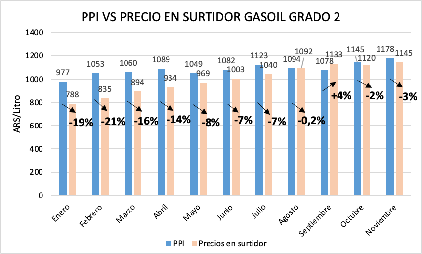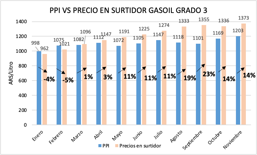 Desde agosto existe cierta convergencia entre los precios teóricos de mercado y los precios en surtidor para estos combustibles de menor calidad. Tras un septiembre donde el precio local fue por primera vez en el año mayor a su PPI (+4%) durante octubre y noviembre se observó un precio en surtidor ligeramente inferior al valor de referencia.