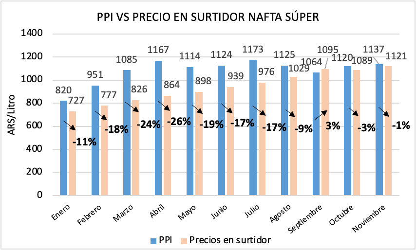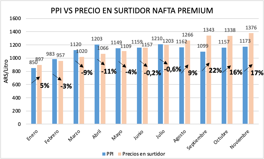 Por su parte, el precio de la nafta premium local comenzó a agrandar su brecha respecto a su PPI en agosto pasado. Tras la renta extraordinaria de septiembre, se observó una disminución octubre, pero un leve repunte en noviembre.