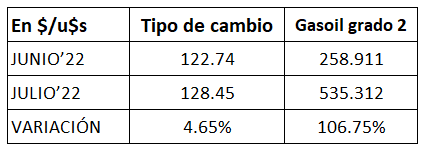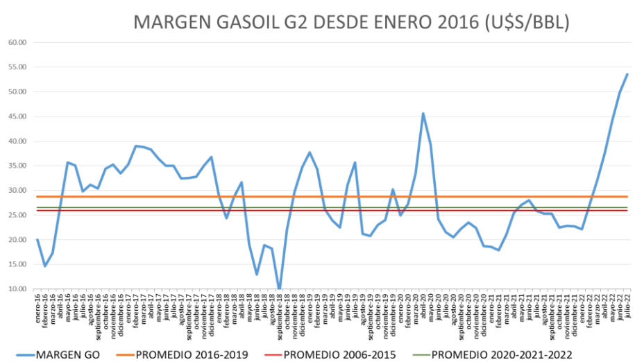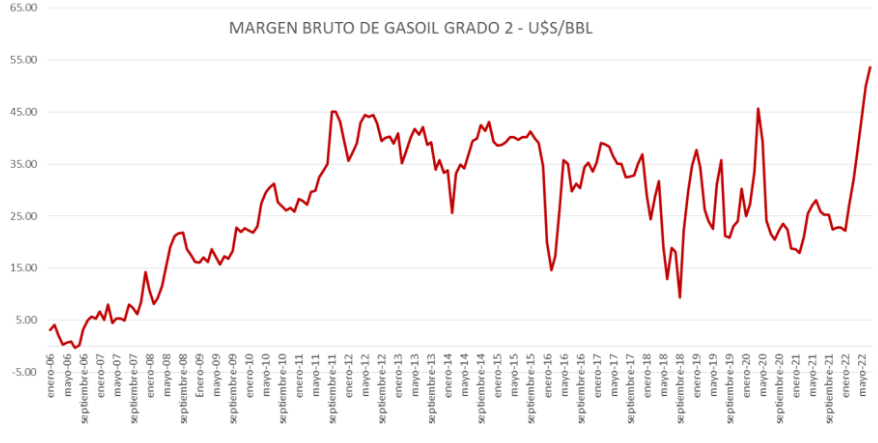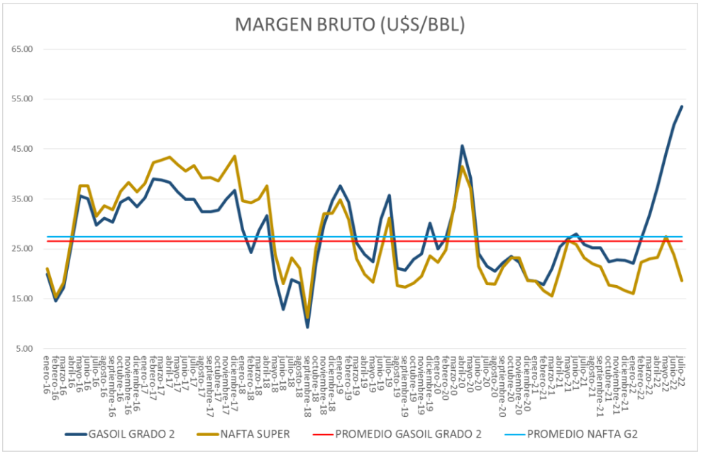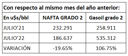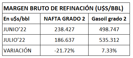 En julio de 2022, por sexto mes consecutivo, se produce un importante incremento del Margen Bruto de Refinación del gasoil grado 2 de un 7,33%, mientras que el de la nafta súper vuelve a bajar, esta vez un 21,7%, ambos respecto a junio del mismo año.