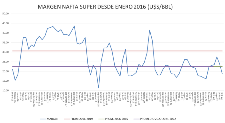 El margen bruto de nafta cae por debajo del valor del promedio del período enero 2020 – junio 2022.