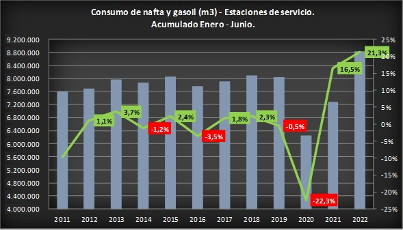 El 2020 finalizó con una caída interanual de la demanda de naftas y gasóleos del 22,2%. No obstante, a partir del primer trimestre del año 2021, las ventas al público de ambos combustibles comenzaron a recuperarse (ver bibliografía), situación que prosiguió en el 2021, donde se registró un aumento en las mismas del 23,5% interanual. Para el primer semestre del año 2022 las ventas de ambos combustibles en las estaciones de servicio marcaron un nuevo record, porcentual y volumétrico (8.826.272 metros cúbicos), con una suba de 21,3%.