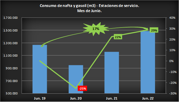 Cabe destacar la mejora en lo que va de 2022 después del histórico e inédito impacto de la pandemia sobre la circulación, la actividad económica y el consumo de naftas y gasoil en las estaciones de servicio a lo largo de todo el año 2020. Asimismo, como se observa en el gráfico anterior, analizando sólo el mes de Junio del 2022 se constata una mejora en las ventas de ambos combustibles del 29% respecto a 2021 y del 17% respecto al 2019 (mismo mes).