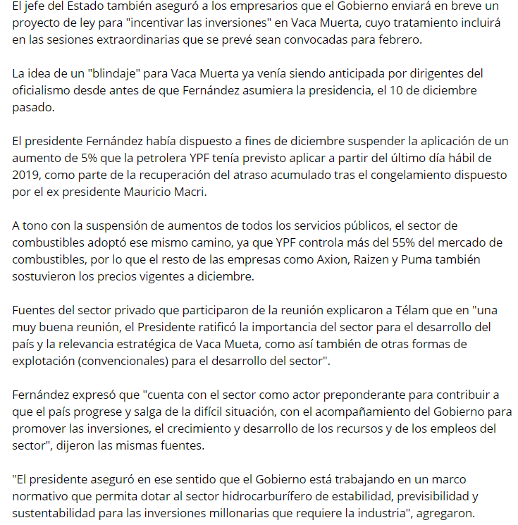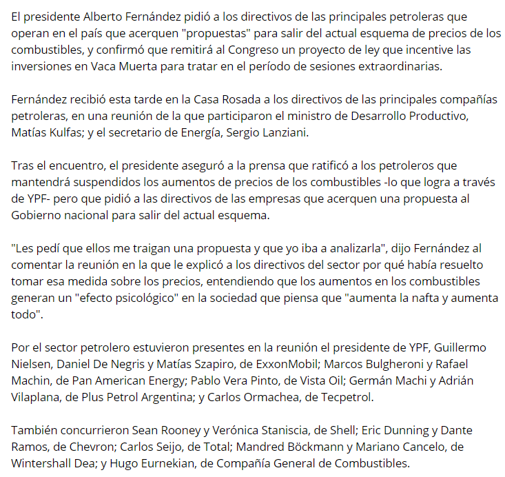 Fernández pidió a las petroleras que presenten propuestas por precios de combustibles El presidente confirmó también que remitirá al Congreso un proyecto de ley que incentive las inversiones en Vaca Muerta GeneralNoticia Principal Por El Estacionero Última actualización Ene 17, 2020 Compartir Télam Compartir