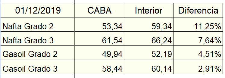 Obviamente y como viene ocurriendo desde hace años, los precios en el interior del país (léase más allá de la avenida General Paz), se mantuvieron bastante por arriba de dichos valores, ubicándose en promedio de la siguiente manera: nafta grado 2 $59.30, nafta grado 3 $66.30, gasoil grado 2 $52.20 y gasoil grado 3 $60,20. El diferencial entre ambas escalas es importante, en especial en el producto que más se vende en las estaciones de servicio, la nafta grado 2 (Súper), como se aprecia en el siguiente cuadro: