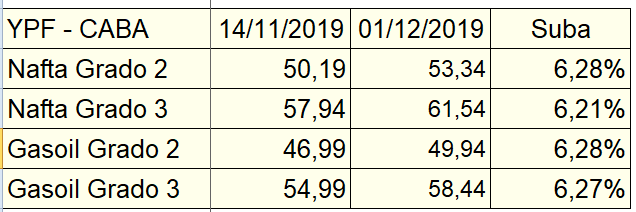 Finalmente y tal como estaba previsto, ayer se incrementaron los precios de los combustibles en algo más del 6%, según la marca y el tipo de producto. En el caso de YPF con una participación del 55% en el mercado, la suba fue de aproximadamente el 6,30%, según el siguiente detalle: