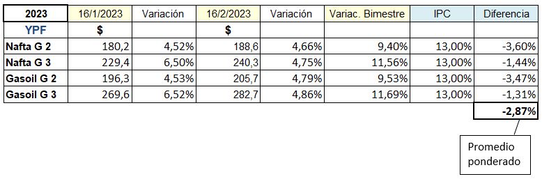 En el caso de la nafta super, el aumento en el bimestre fue un 3,60% menor que la inflación, mientras que el promedio de los incrementos ponderado (según la participación de cada producto en las ventas de las estaciones de servicio), estuvo un 2,87% por debajo del IPC.