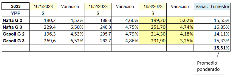 El aumento promedio ponderado en el primer trimestre del año, fue del 15,31%. Eso significa que para terminar el trimestre igualando el incremento de los combustibles con IPC, la inflación de marzo no debería ser mayor que del 2,5%. Como eso no ocurrirá, la renta de las estaciones de servicio continuará bajando.