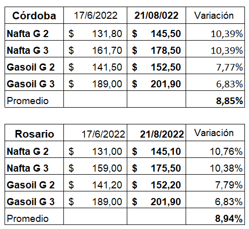 En general, y considerando las zonas que no gozan de una disminución del impuesto a los combustibles líquidos, los incrementos de los precios de venta al público, se ubican en torno al 10,3% en las naftas y 7,3% en el gasoil. Tomando los casos de las ciudades que ocupan el segundo y tercer lugar en ventas en el país (Córdoba y Rosario), los datos son los siguientes: