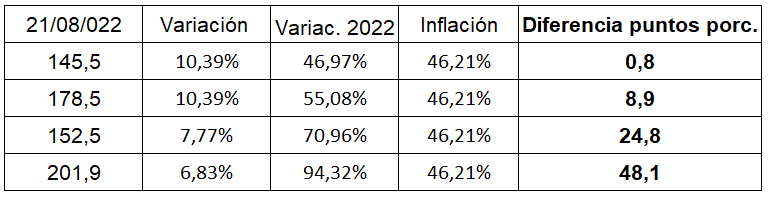 Si comparamos la evolución de los precios de los combustibles con la del índice de precios al consumidor (inflación) vemos que en el año en curso y hasta la fecha, los combustibles se mantiene en el mismo porcentaje (caso nafta súper) y hasta más del doble (caso gasoil premium). Sin embargo, cabe mencionar que el año 2021 finalizó con una variación de los combustibles del 36,75% vs. una inflación del 50.9%
