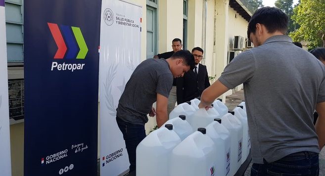 Por otra parte y en el marco de las acciones solidarias contra el coronavirus, la petrolera estatal Petropar entregó la primera tanda de los 10.000 litros de alcohol diluido al 70% al Ministerio de salud de Paraguay. La segunda tanda será repartida en forma gratuita al público el próximo sábado. Desde la empresa indicaron que la medida fue adoptada ante la escases del producto en el mercado y como una forma de contribuir a preservar la salud pública del Paraguay.