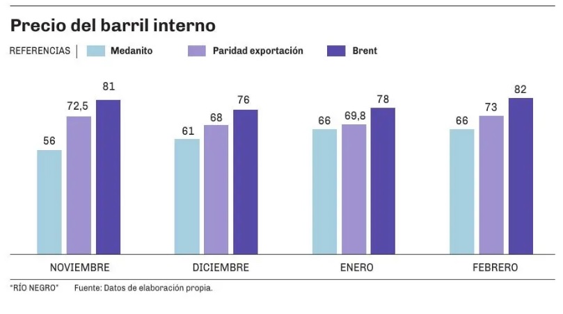 La clave. US$ 66 es el precio promedio que se pagó en febrero por los barriles de tipo Medanito en las refinerías del país. Son 10 dólares más que en noviembre.