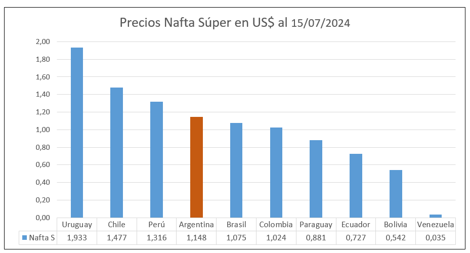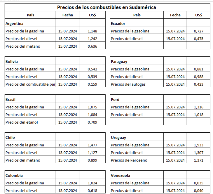 Para tratar de tener una idea lo más certera posible respecto a este tema, el estacionero.com consultó los datos del sitio estadounidense Global Petrol Prices. Se filtró los datos por tipo de combustible y país, tomando los principales de Sudamérica, y se obtuvieron los siguientes resultados: