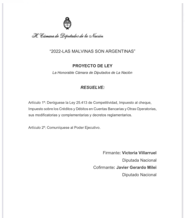 La diputada Victoria Villarruel del partido “La Libertad Avanza”, cuyo titular es el diputado Javier Milei, presentó un proyecto de ley que establece la derogación de la ley 25.413 que crea el impuesto a los débitos y créditos bancarios. La legisladora se reunió recientemente con Expendedores de Combustibles Autoconvocados de la República Argentina, en un encuentro presencial para los estacioneros de Córdoba donde se llevó a cabo, y vía zoom para los del resto del país.
