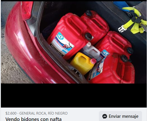 Otros ofrecían por mayor cantidad; 2600 pesos los 20 litros de nafta y el traslado se hacía en el baúl de un vehículo lo que había generado la crítica de varios vecinos.